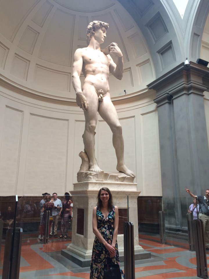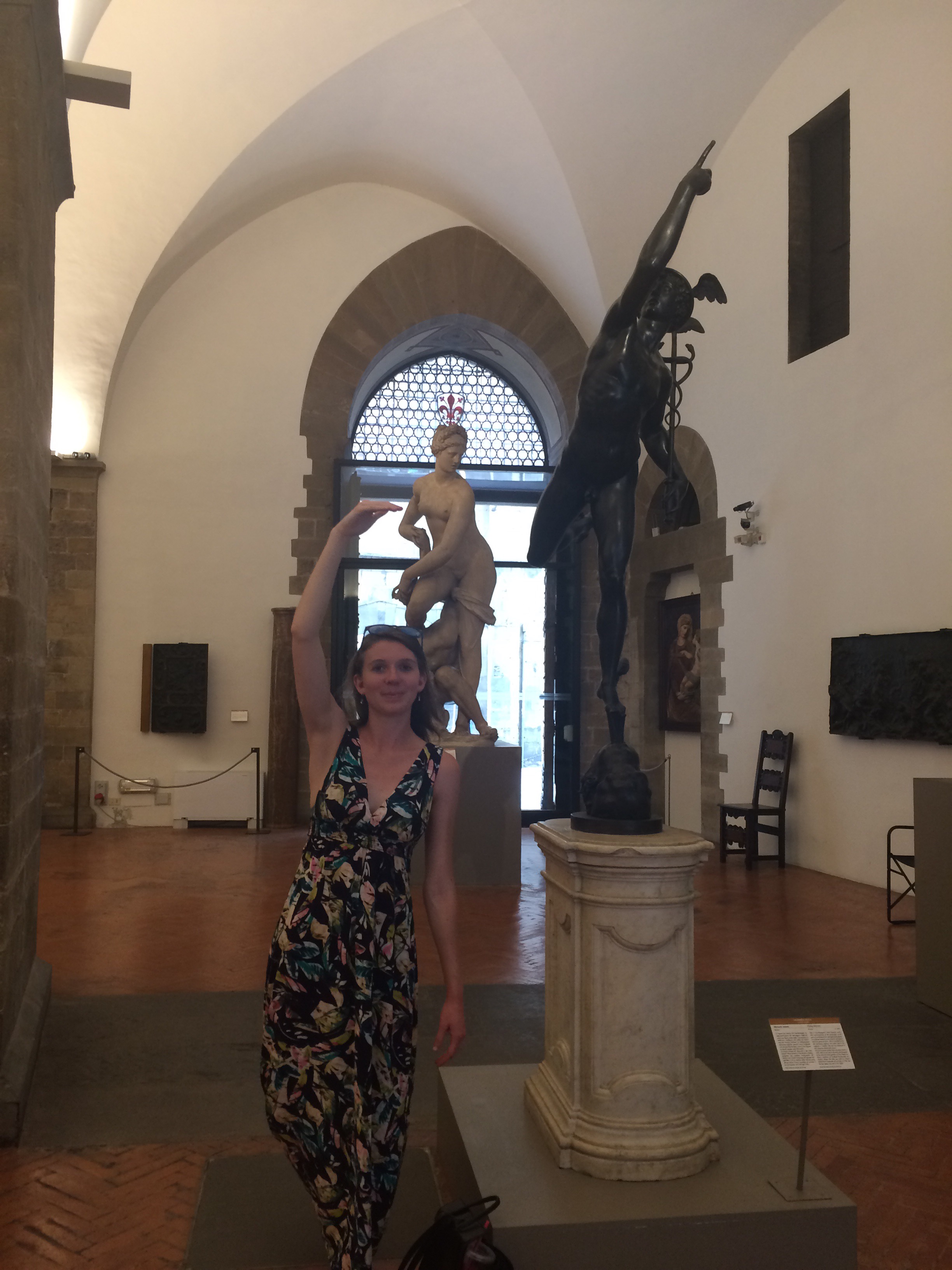 – sculpture museum of Michelangelo, Donatello, and Medici treasures. The picture below is with a statue of Hermes while mid-flight. Aren’t I graceful?
