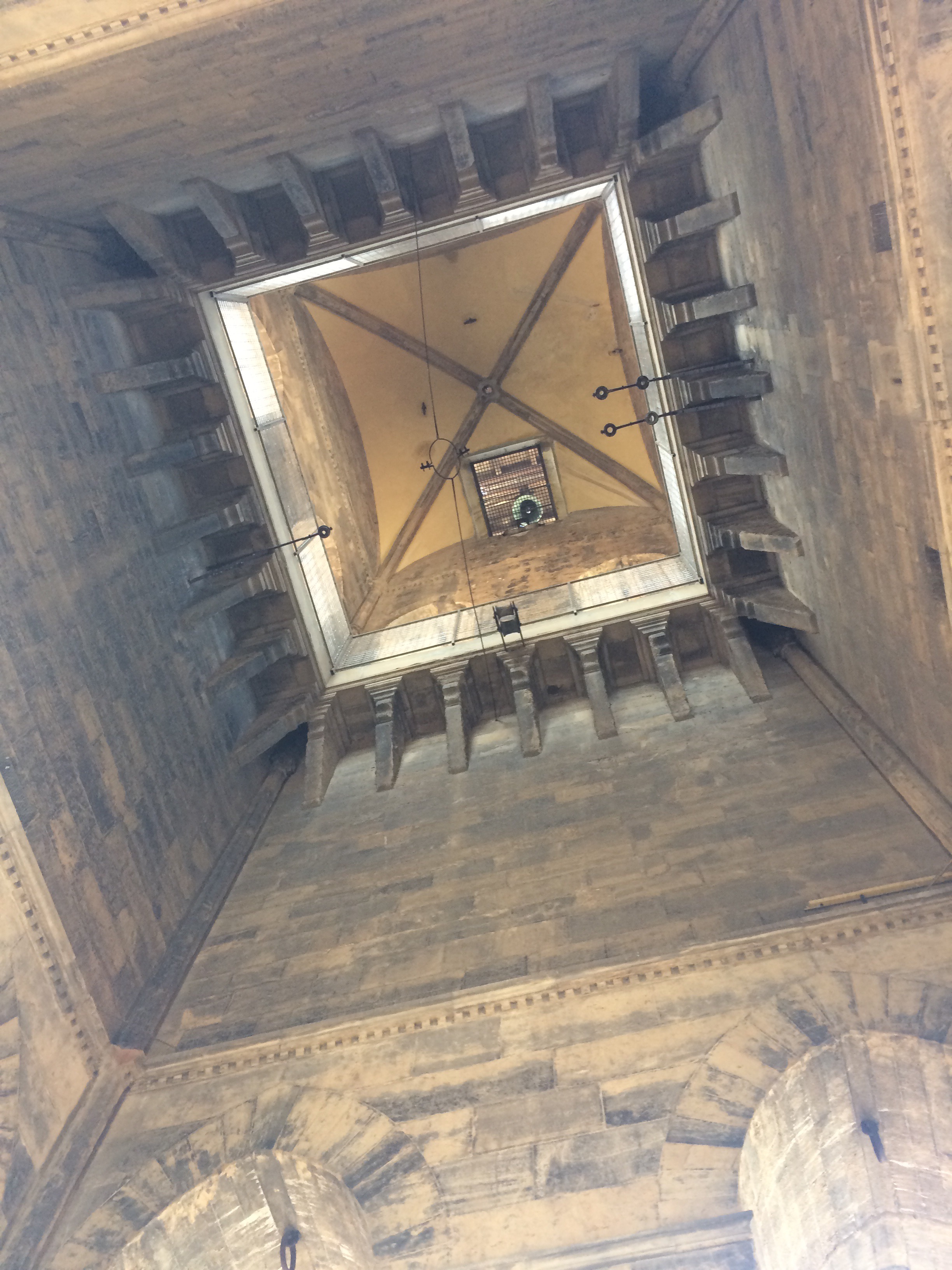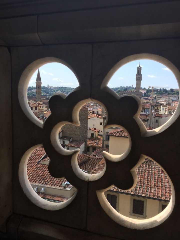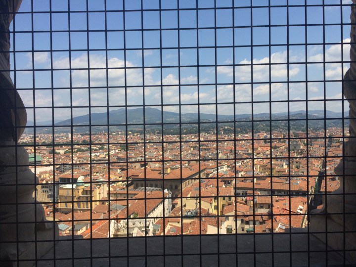 – conventiently located next to the Duomo. Rick Steves mentioned that climbing the bell tower gives the same effect as the top of the Duomo (you can see the entire city of Florence!) We walked up about 400 very narrow steps and corridors, while other tourists used the same passageways to come down. It was very squished, but definitely exciting. I took pictures along the way and through mini windows to get the whole experience. We were even inside the tower when the bell rang at 11:30! I am very afraid of heights, but everything there was to see was either above the height of the tower (like the dome) or at eye level so I didn’t have to look down much.