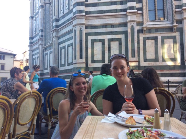 On the first day, we ended up eating at a “wine bar restaurant” near the Baptistry. We had the daily special of lasagna, patates, bruschetta, and vino rose.