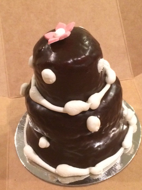 I was tempted by my eyes when buying cake tonight after dinner. This tiered mini cake looked so cute and yummy – with the chocolate on the outside and vanilla cake within… However, the chocolate frosting is more like ganache and doesn’t have much flavor. And unfortunately, the cake is too sweet and somewhat sticky.