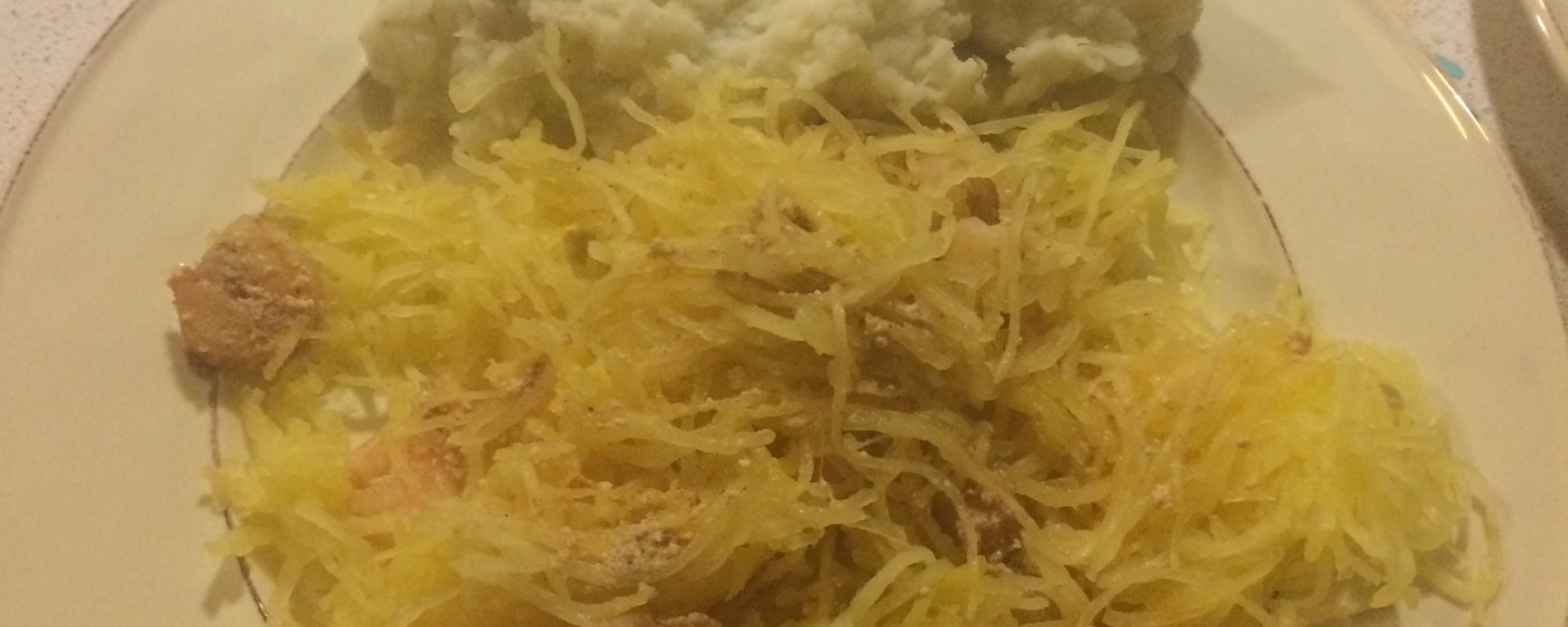 I have had the spaghetti squash recipe below from eatyourselfskinny.com for years! This time, instead of chili flakes, I used chili powder and I was worried it might end up too spicy for me (after a bunch of powder came out of the lid into the shrimp sauce :o) However, it turned out perfect because most of the spice cooked off and was mellowed down with the yogurt base.