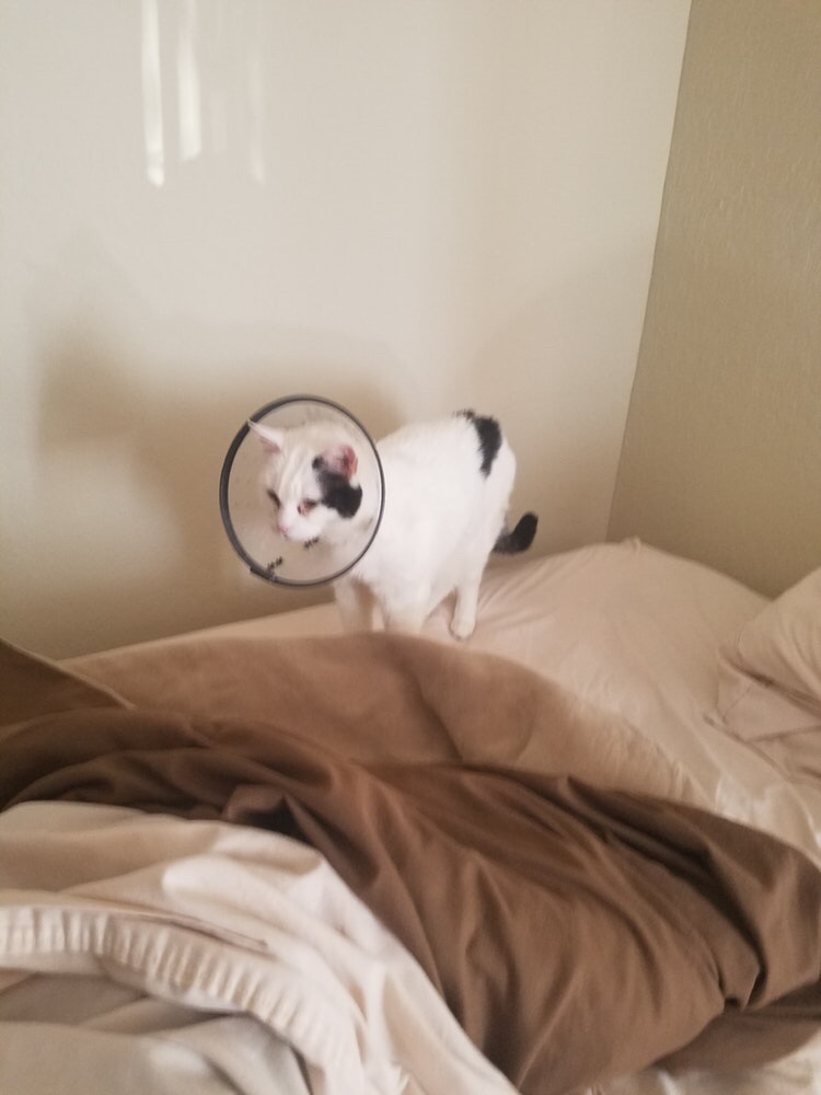 This demon appeared in my litterbox one day and told me that I would be haunted until Mom and Nathan came home – this made me very anxious so I kept licking and licking until I required this (put picture of Patch in his cone)