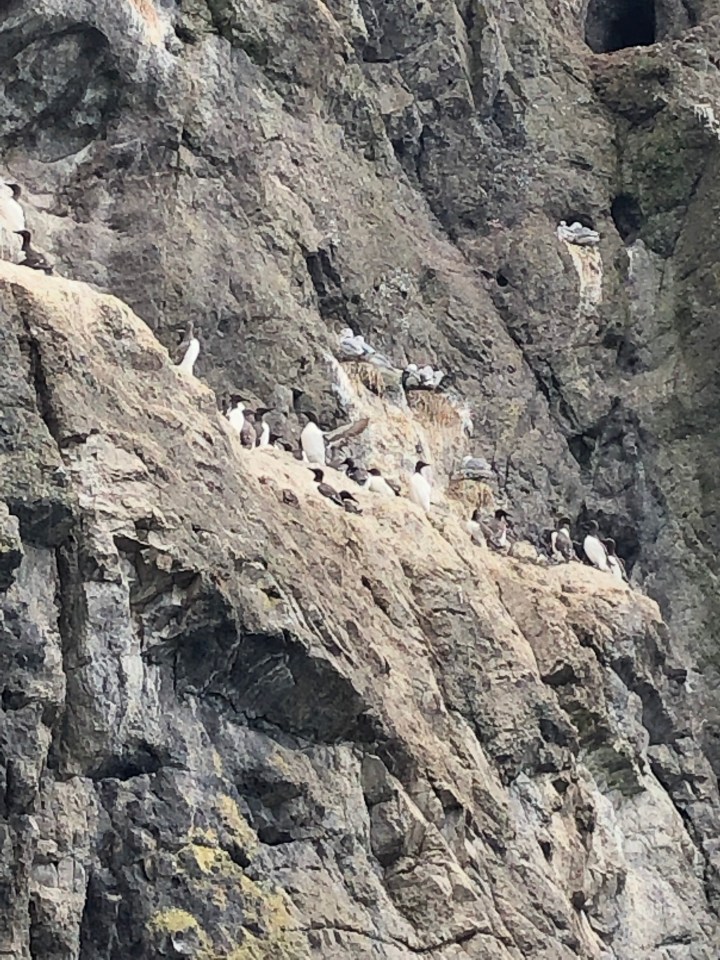 As we come around a bend, all we can hear is squawking of easily 500 nesting birds 😮 There were tons of the dads coming in and out of these holes in the side of the cliff to gather food. The mamas were sitting on the nests, and you can see some fluffy babies! Nathan and I are BIG on watching nature shows – so I was instantly put into an episode on Coastal Cliffs and it clicked that some of the footage could be in Northern Ireland. There were mamets, puffins, a few different types of gulls, among many other birds that were nesting. I was totally geeking out, saying these like “one is fledging!” at the sight of a baby who started moving its wings in the nest haha. It was probably the last half of the hike that we were in awe at this naturally occurring display, and I was loving it! I really felt like David Attenborough would appear at any moment with a camera and commentary 😀