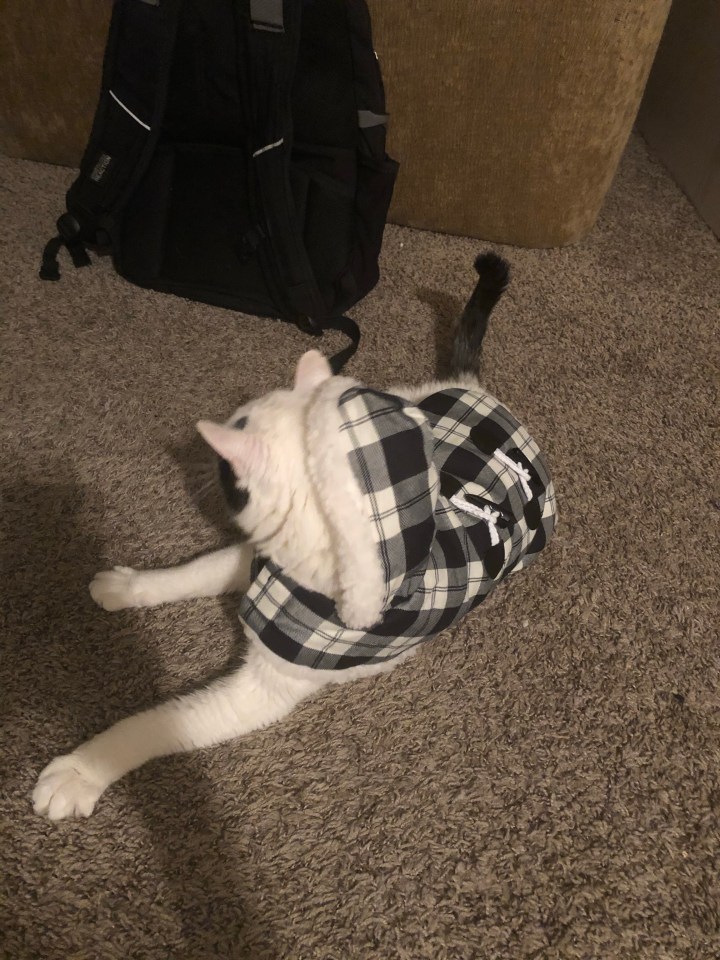 I don’t see the bag anymore so I’m glad that she listened and took it back to the place she got it from. She also tried a weird red coat but that didn’t last very long. I like my soft white and black fur and don’t need it covered up with coats!