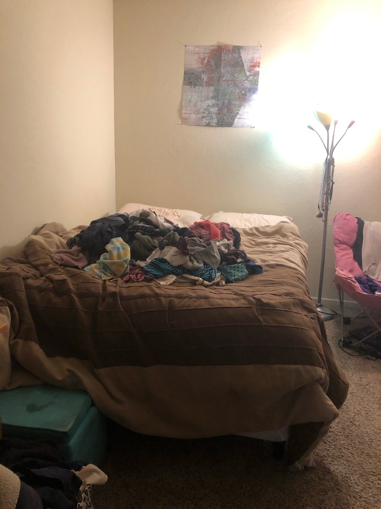 My cat, Patches, also referred to as “peep,” has recently found solace in snuggling on the pile of covers (when we don’t make the bed) or pile of laundry (before we put it away).