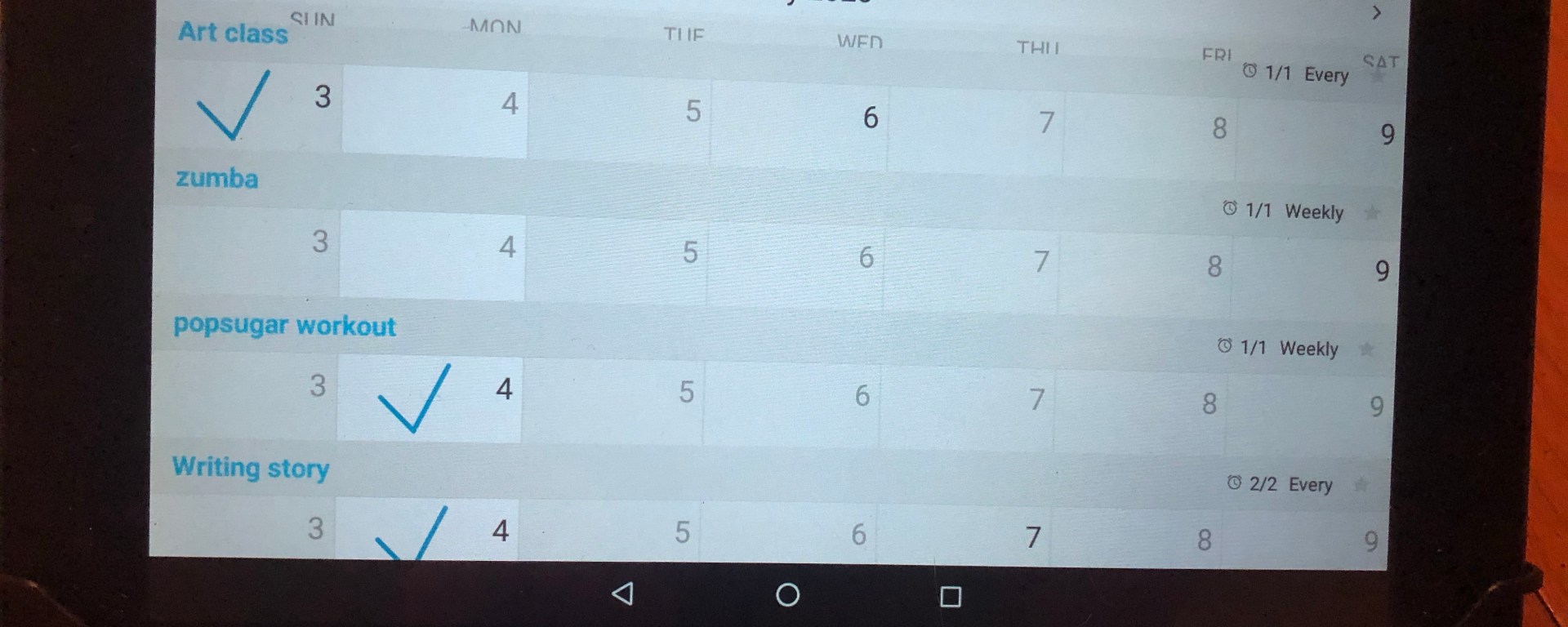 I used “Goal Tracker,” which is an app on my tablet, and have working out Monday/Wednesday/Fridays (popsugar, my friends live workouts, and Zumba) then I placed in writing my story 3 days a week and doing my art class 3 days (I varied the start day so they aren’t on the same days), and interspersed reading and modpodge as well.