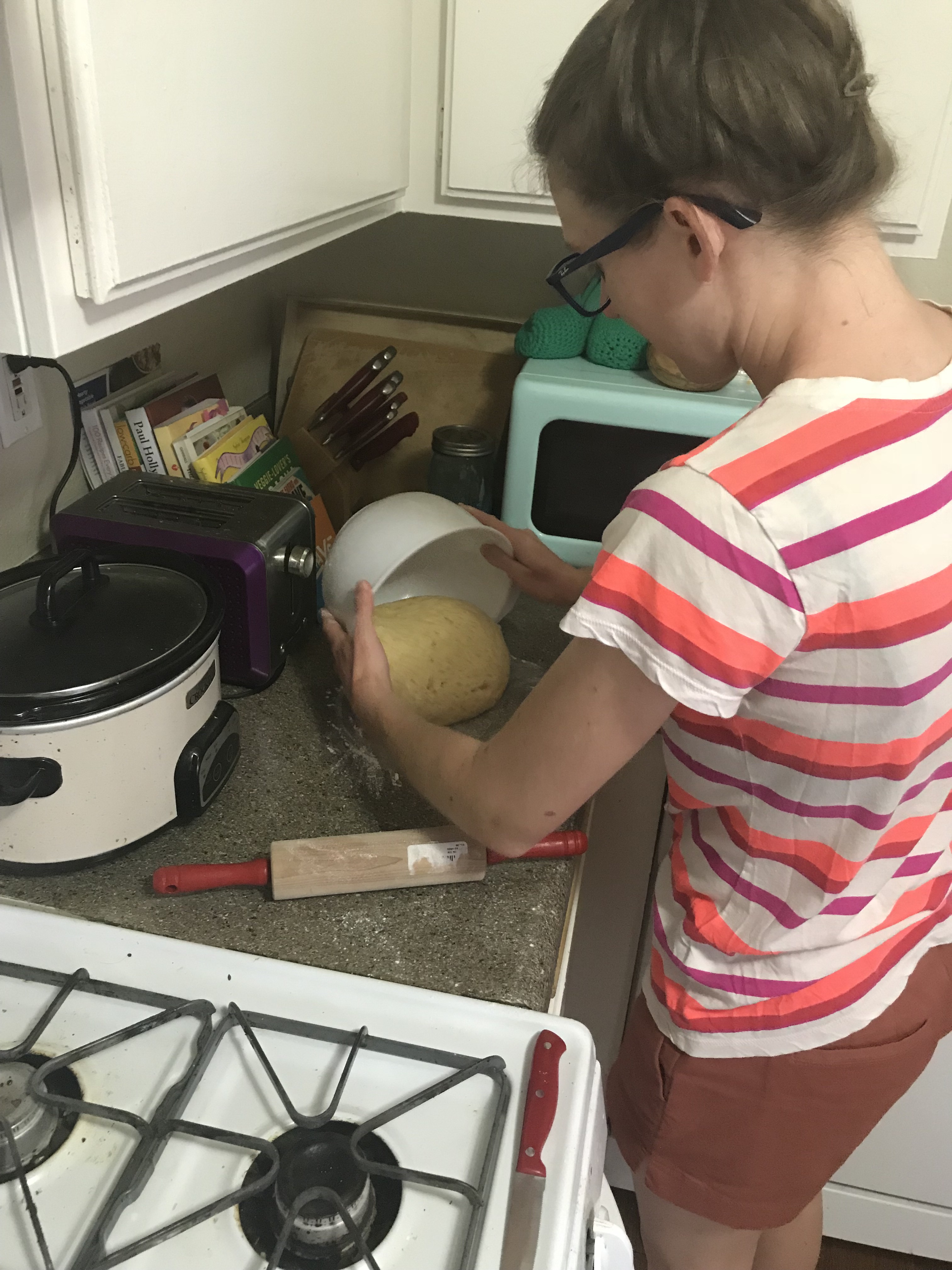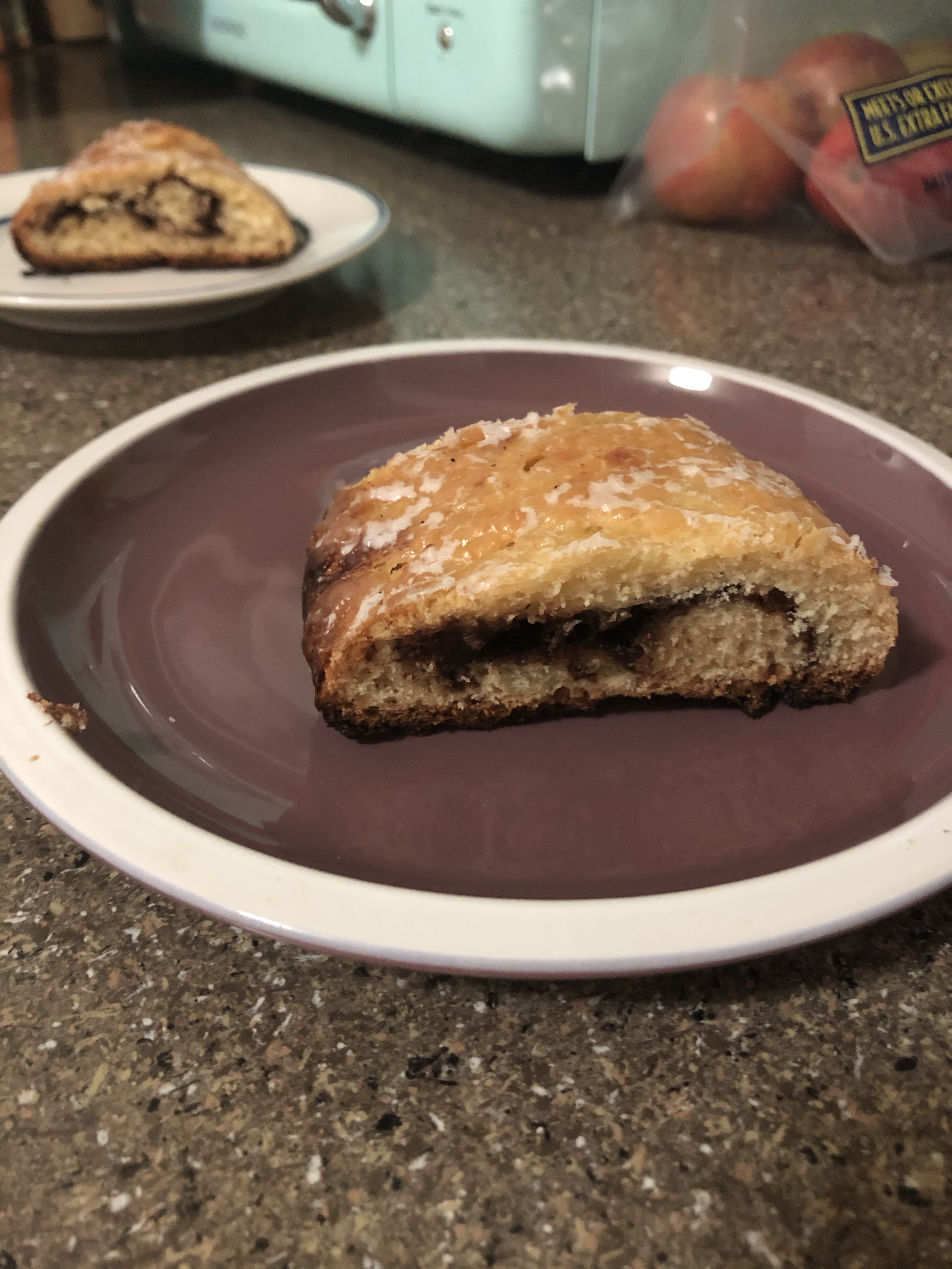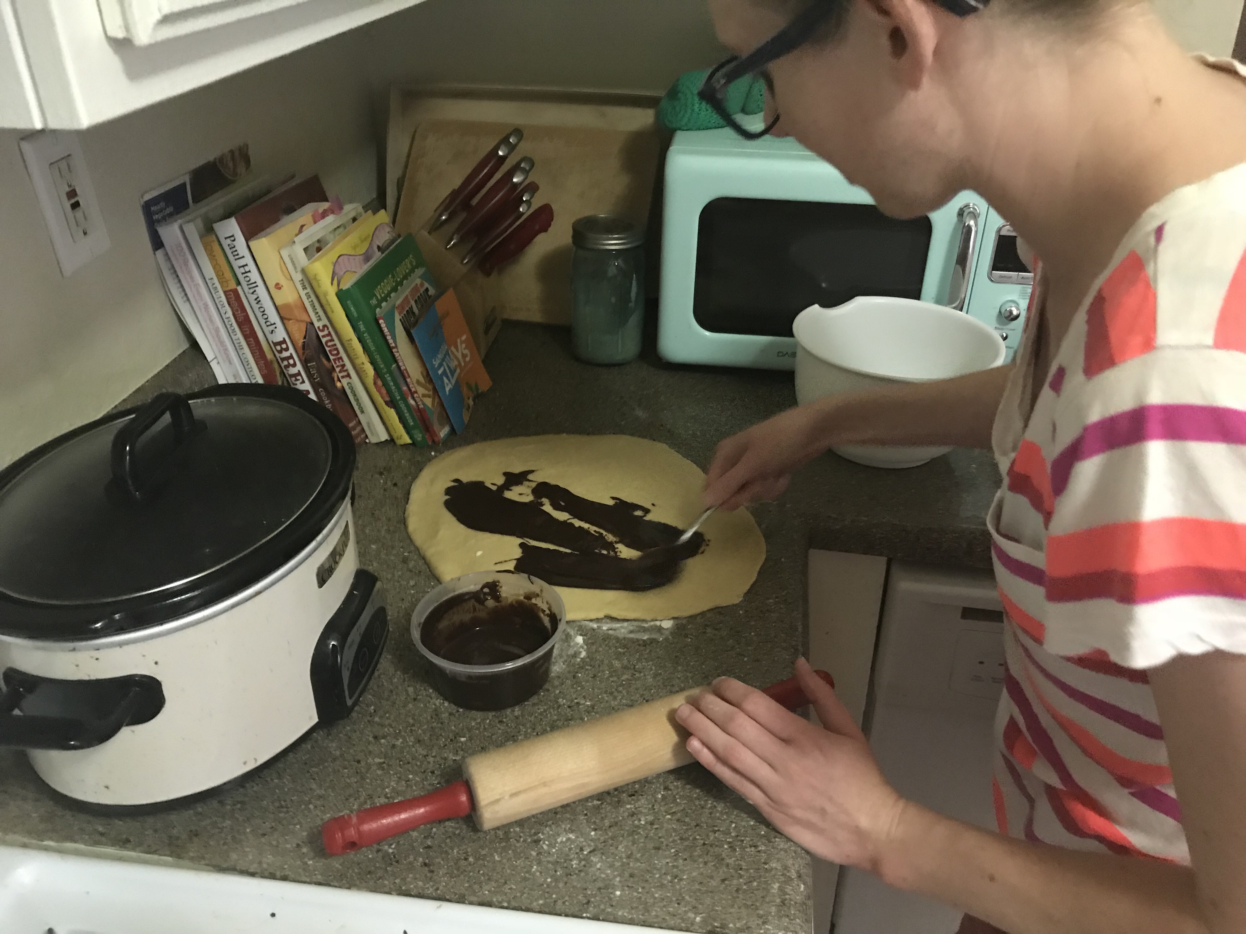 – make and prove the sweet dough, roll it out, add chocolate filling (don’t have the chocolate too melted!),