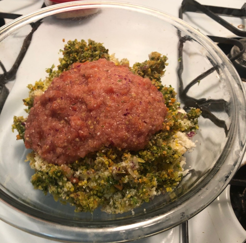 I blitzed cauliflower, carrots, onion, tomato, and lettuce grown from our garden (!) in the food processor until they were finer than diced.