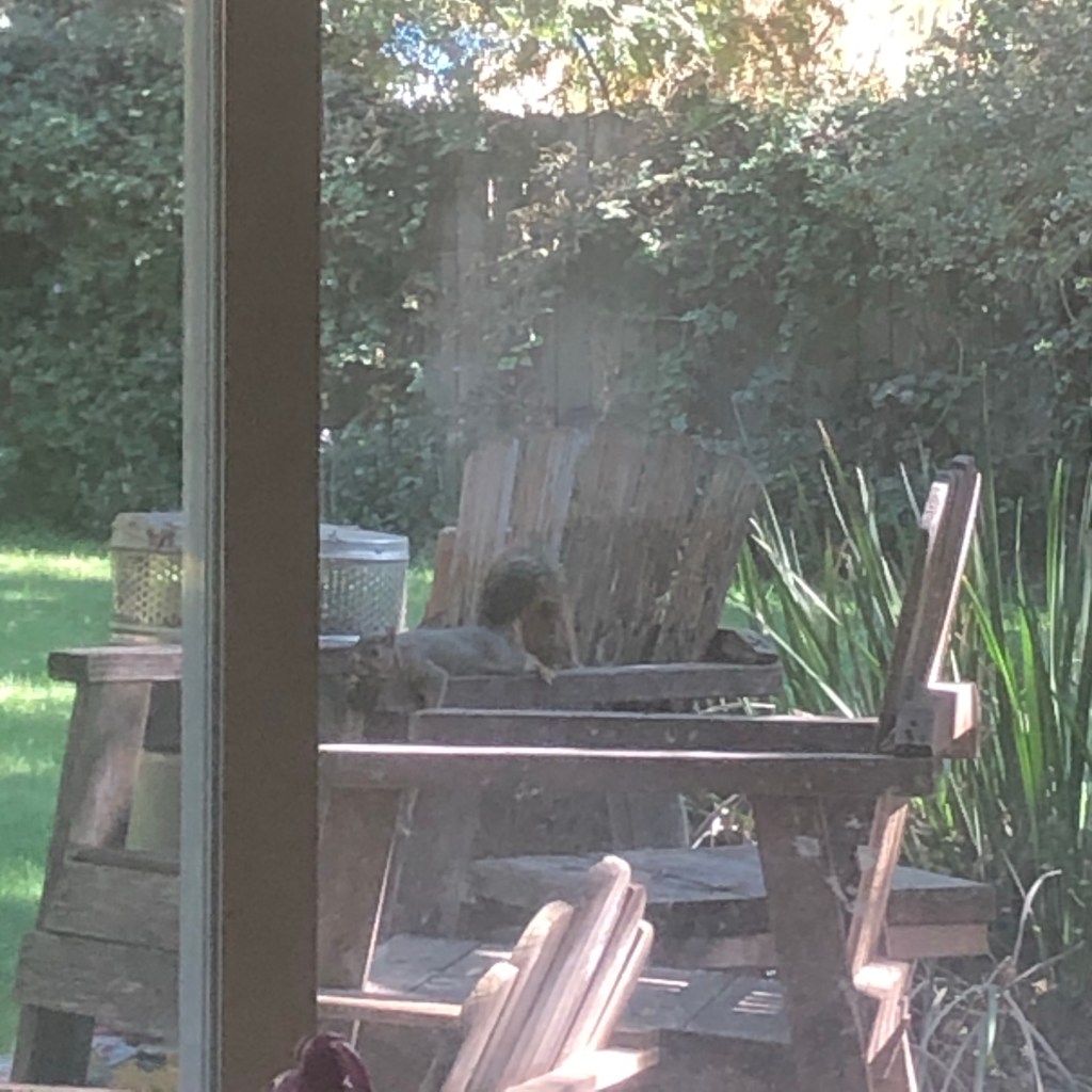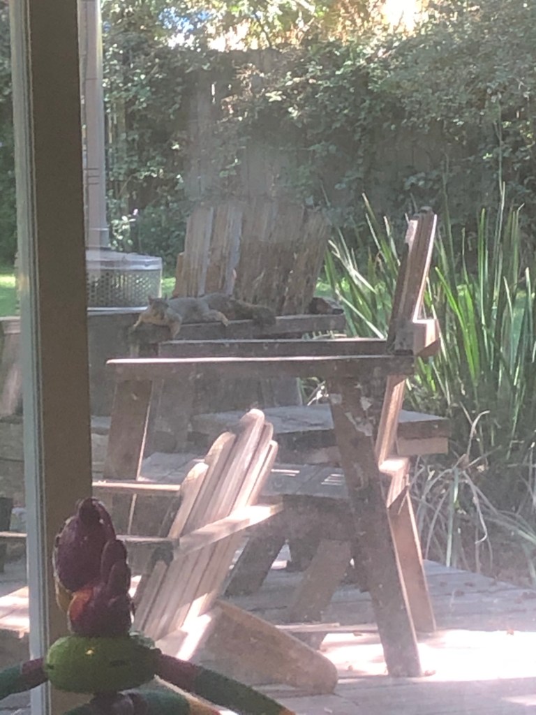 I found some solace and comfort in this lounging squirrel! He just looked so calm and at ease to be laying on the porch table/chair as well the tree stump 🙂