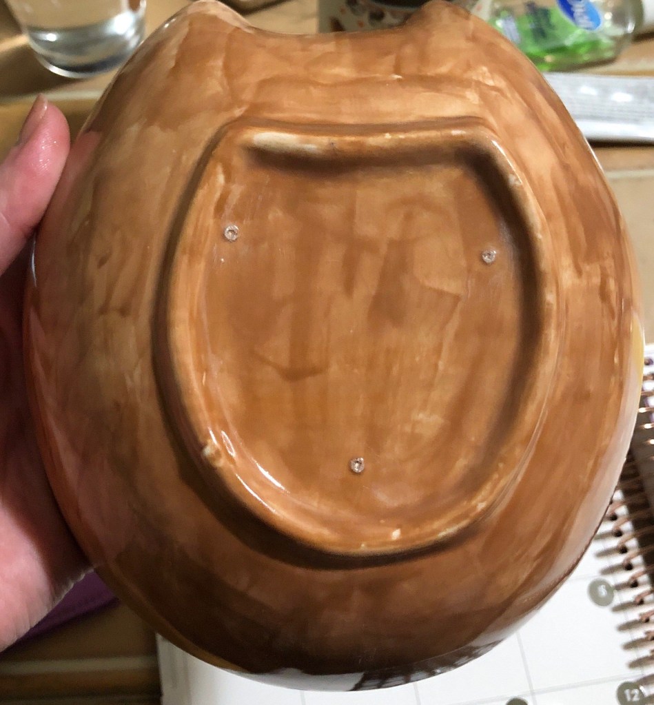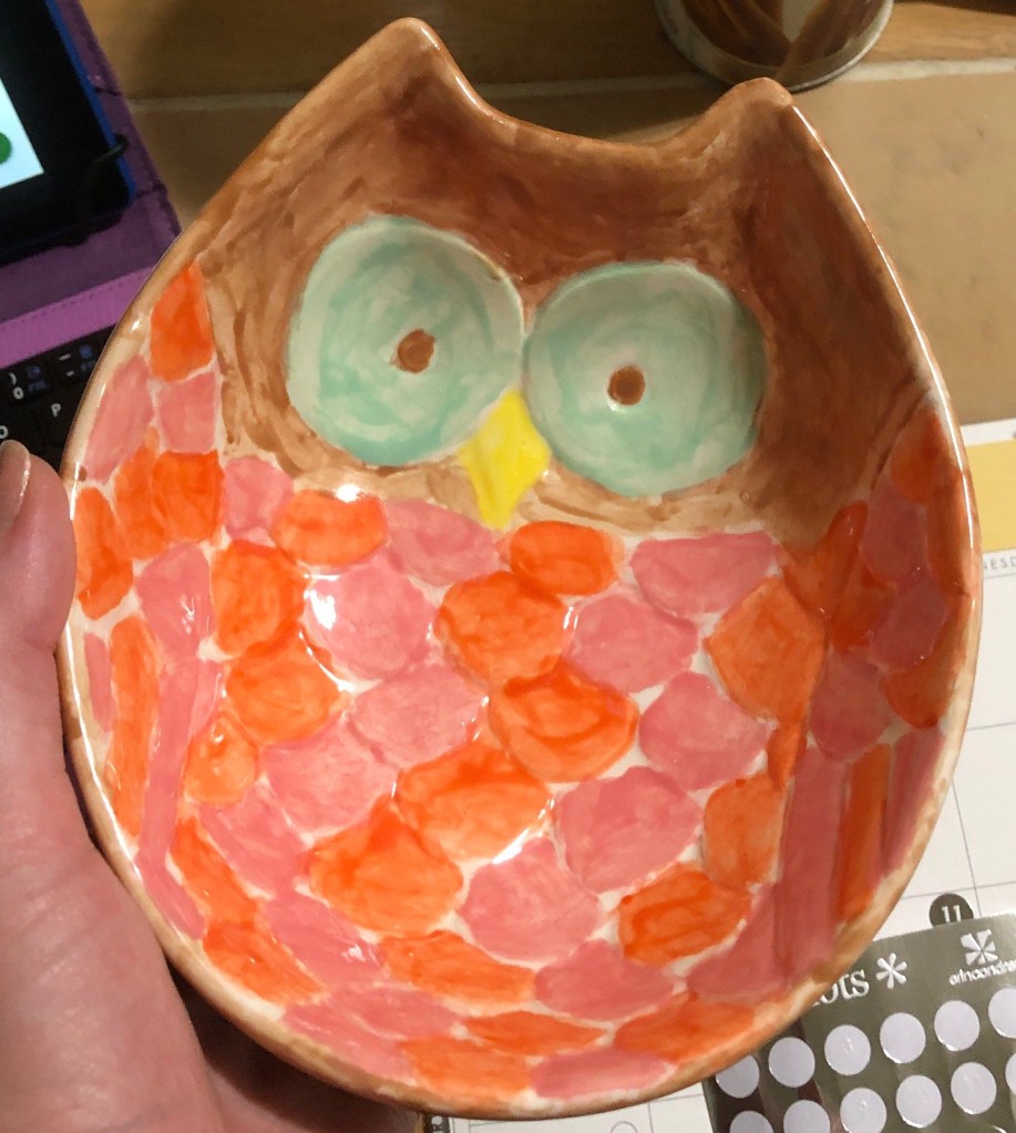 I chose to paint an owl bowl – I did the body brown, the eyes blue and the beak yellow.