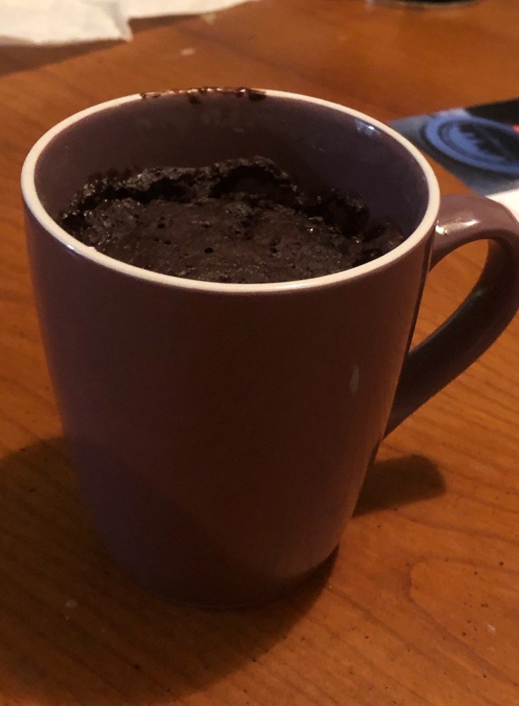 Here is the recipe I used Microwave Chocolate Mug Cake – you put all the dry ingredients in first and stir them, then add the wet and stir again. Lastly, you microwave it for about 1 min 45 seconds.
