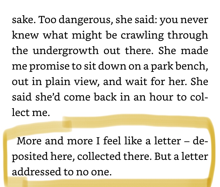 I love the way that I can visualize how downtrodden the character is feeling just by reading the highlighted section. She is dropped off and then picked up by has no true purpose or place to go.