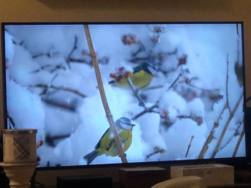 As the pure white of snow fills the trees, there is still a flash of vibrant yellow and blue.