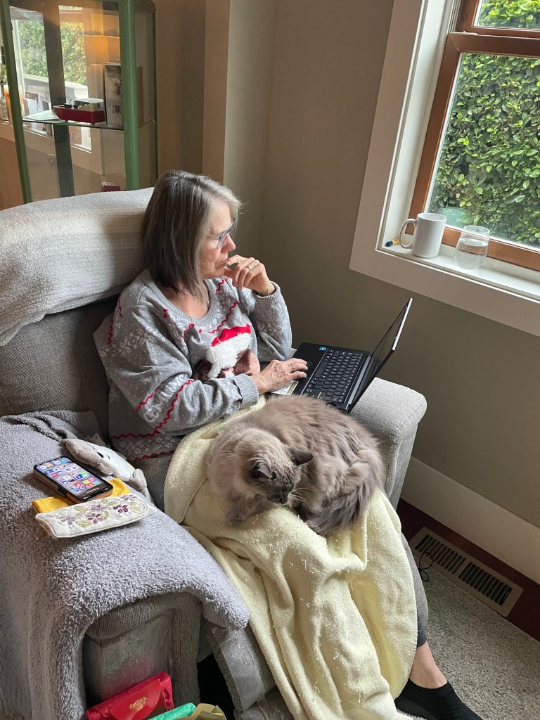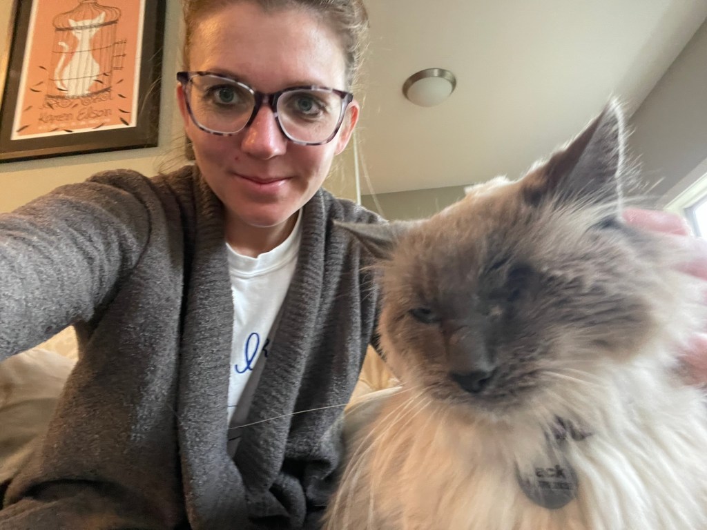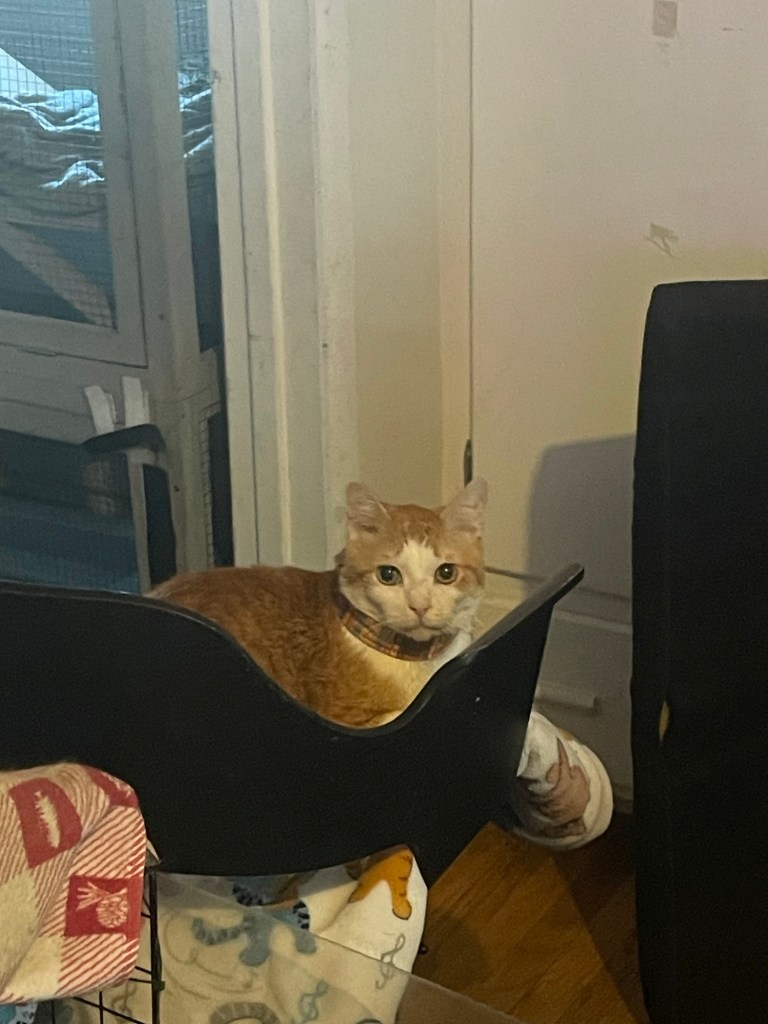 He only has one eye now and his meow is scratchy but he is so sweet! Probably about 16-17 years at this point, and I love seeing him over the holidays!