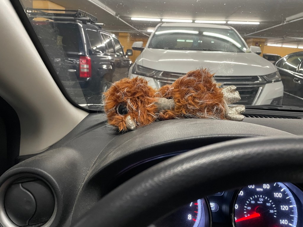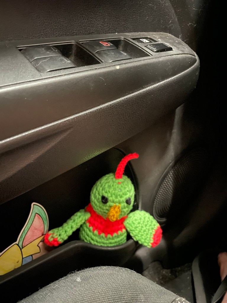The brown ostrich is from our first valentines, and the green and pink parrot is from yesterday (he gave it to me because his car broke down and I drove across LA to get him).