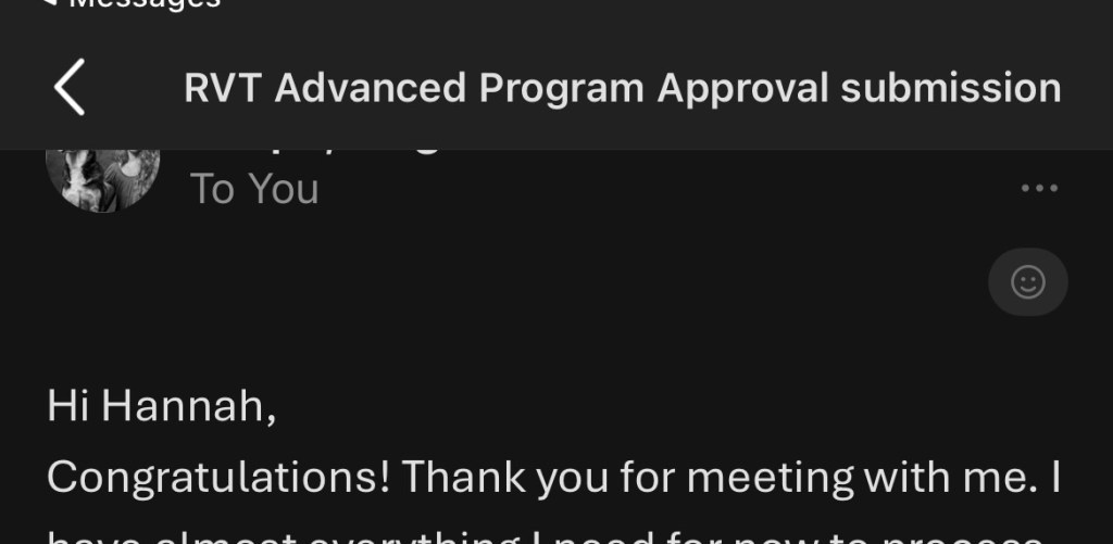 I have been on the path for the RVT program, finishing all the necessary pre-requisites and working in the animal field for a few years. An RVT is basically the nurse for a veterinarian (getting blood samples, doing vaccines, making meds etc).